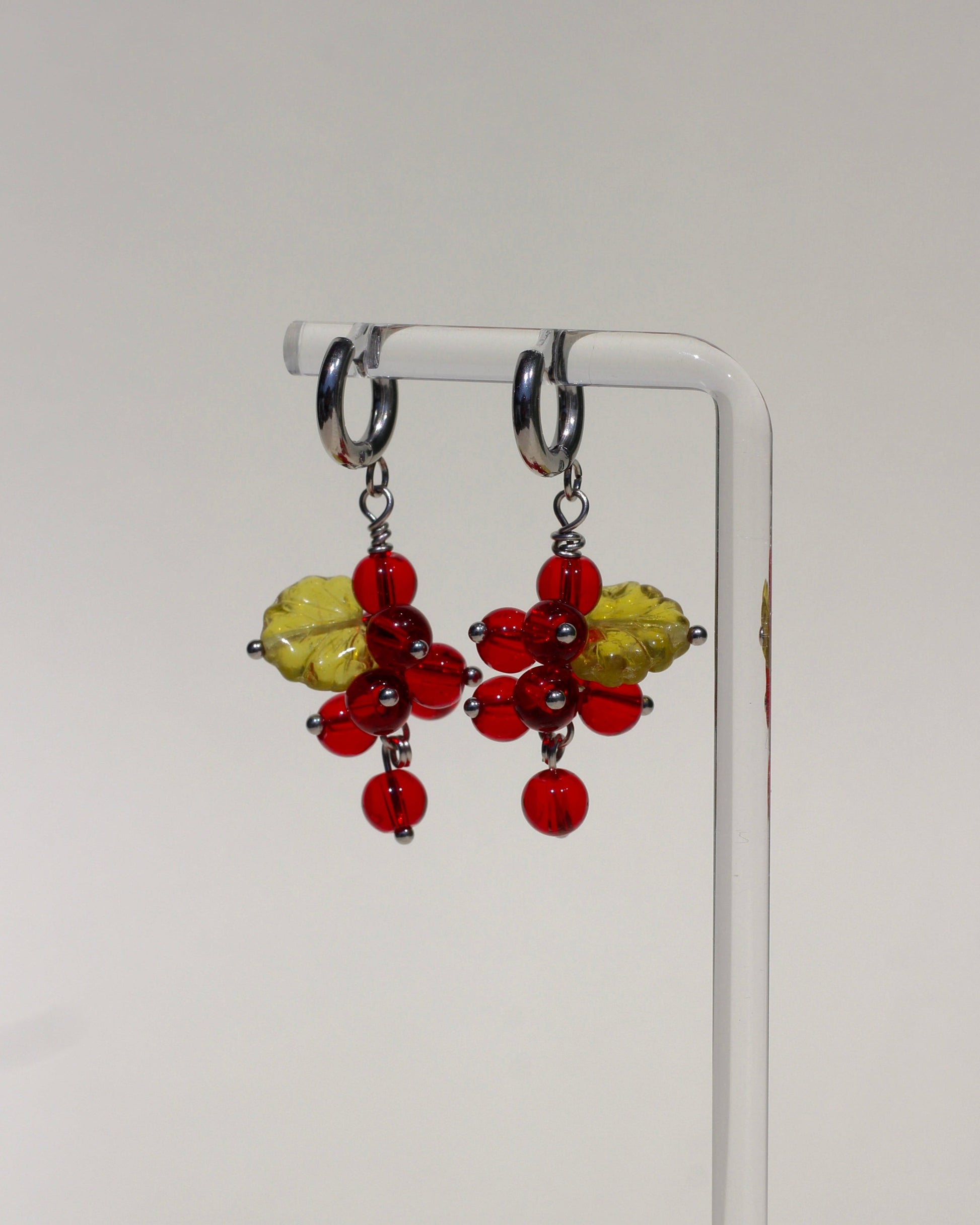 Punaviinimarjat saivat inspiraationsa lapsuudenkodin puutarhasta, jossa nämä herkullisen kirpeät marjat kasvavat. Korvakorujen lasihelmet hohtavat kauniisti auringossa ja niiden punainen väri piristää asua kuin asua.