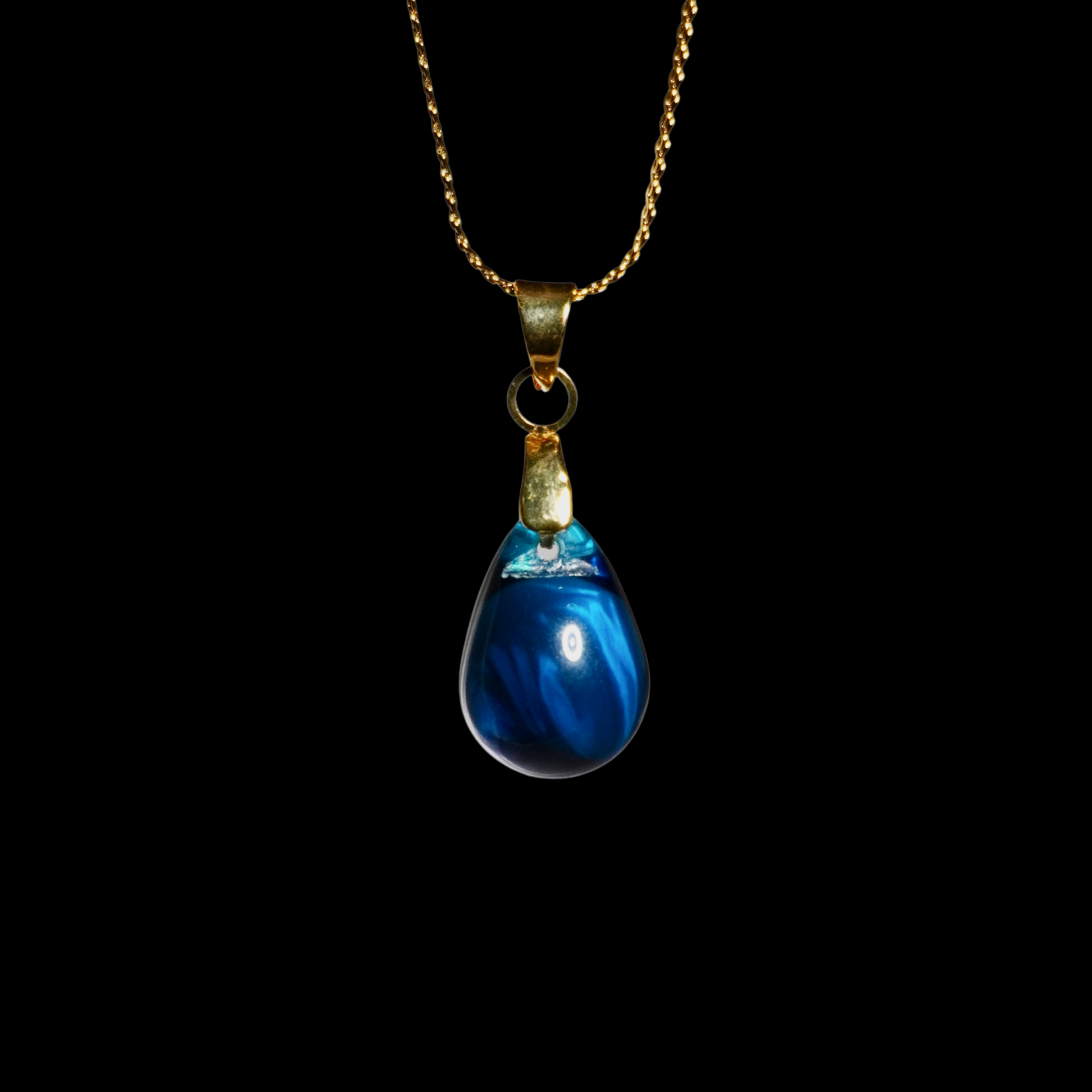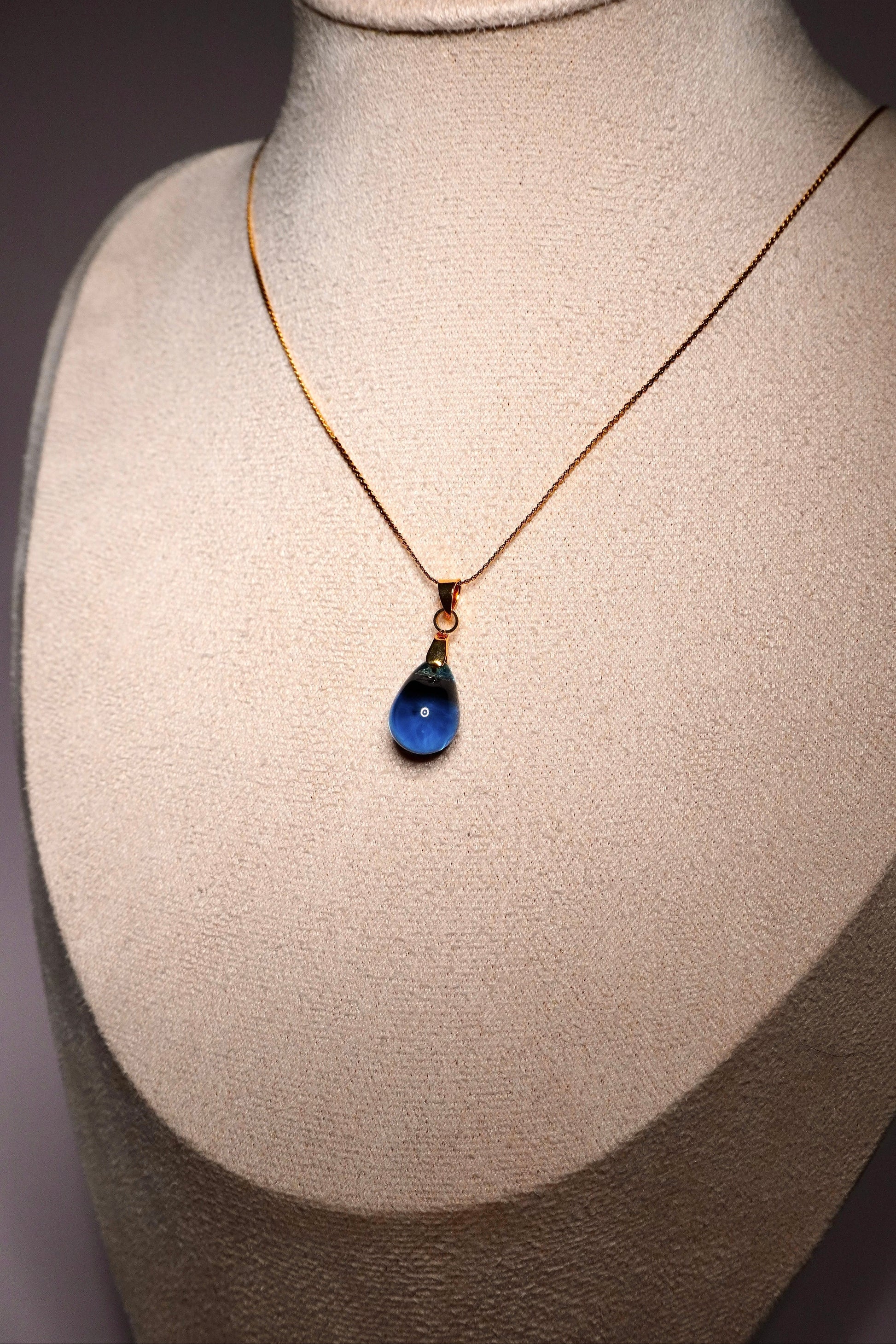 Yö-kaulakoru on siro mutta näyttävä, ja siinä hohtaa kaunis lasihelmi.